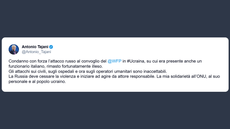 Il ministro degli Esteri, Antonio Tajani, ha scritto su X: «condanno con forza l’attacco russo al convoglio del programma alimentare Mondiale in Ucraina, su cui era presente anche un funzionario italiano, rimasto fortunatamente illeso. Gli attacchi sui civili, sugli ospedali e ora sugli operatori umanitari sono inaccettabili. La Russia – conclude Tajani – deve cessare la violenza e iniziare ad agire da attore responsabile. La mia solidarietà all’Onu, al suo personale e al popolo ucraino».