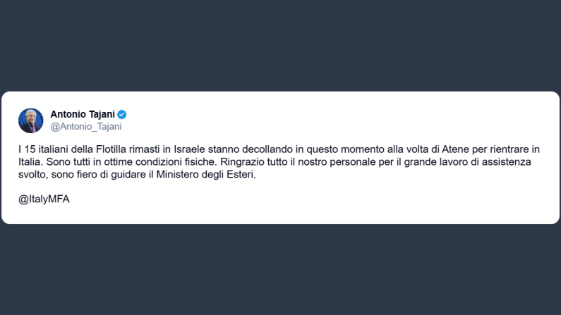 Il ministro degli Esteri, Antonio Tajani, ha dato su X l’aggiornamento sulla rimpatrio degli italiani della Flotilla: «I 15 italiani della Flotilla rimasti in Israele stanno decollando in questo momento alla volta di Atene per rientrare in Italia. Sono tutti in ottime condizioni fisiche. Ringrazio tutto il nostro personale per il grande lavoro di assistenza svolto, sono fiero di guidare il ministero degli Esteri».