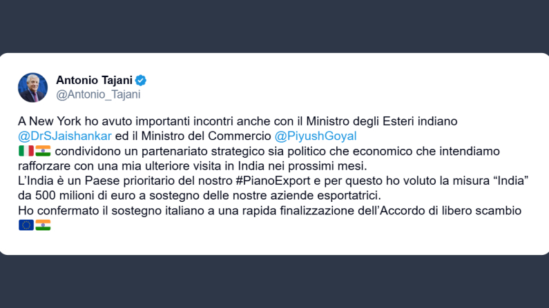 Il ministro degli Esteri, Antonio Tajani, ha annunciato su X gli incontri avvenuti con il ministro degli Esteri indiano S. Jaishankar e il ministro del Commercio Piyush Goyal, avvenuti a margini dell’Assemblea generale dell’Onu a New York. «L’India è un Paese prioritario del nostro piano Export e per questo ho voluto la misura India da 500 milioni di euro a sostegno delle nostre aziende esportatrici», ha dichiarato Tajani. Il ministro ha inoltre sottolineato l’importanza di rafforzare il partenariato politico ed economico con l’India e ribadito il sostegno dell’Italia alla rapida conclusione dell’Accordo di libero scambio tra Unione europea e India.