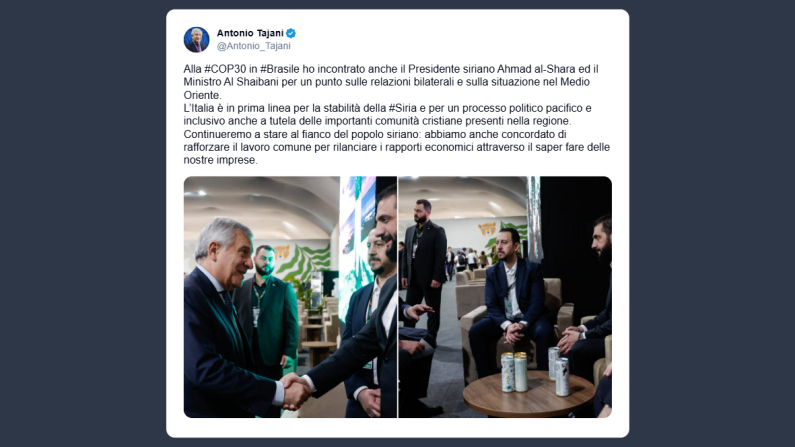 Il ministro degli Esteri, Antonio Tajani, ha dichiarato su X: «alla Cop30 in Brasile ho incontrato anche il presidente siriano Ahmad al-Shara ed il ministro Al Shaibani per un punto sulle relazioni bilaterali e sulla situazione nel Medio Oriente. L’Italia è in prima linea per la stabilità della Siria e per un processo politico pacifico e inclusivo anche a tutela delle importanti comunità cristiane presenti nella regione. Continueremo a stare al fianco del popolo siriano. Abbiamo anche concordato di rafforzare il lavoro comune per rilanciare i rapporti economici attraverso il saper fare delle nostre imprese».