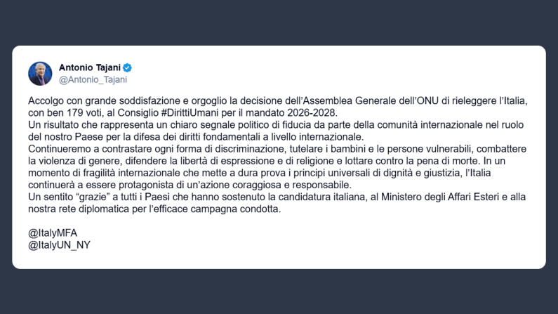 «Accolgo con grande soddisfazione e orgoglio la decisione dell’Assemblea Generale dell’Onu di rieleggere l’Italia, con ben 179 voti, al Consiglio Diritti Umani per il mandato 2026-2028». Lo ha dichiarato su X il ministro degli Esteri, Antonio Tajani, evidenziando poi che il risultato rappresenterebbe un chiaro segnale politico di fiducia da parte della comunità internazionale nel ruolo del Paese per la difesa dei diritti fondamentali a livello internazionale.