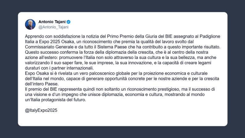 Per il ministro degli Esteri l’Expo di Osaka si è rivelata un vero «palcoscenico mondiale per la proiezione economica e culturale dell’Italia nel mondo, capace di generare opportunità concrete per le nostre aziende e per la crescita dell’intero Paese». Il premio del BIE, conclude Tajani, rappresenta quindi «non soltanto un riconoscimento prestigioso, ma il successo di una visione e d’un impegno che unisce diplomazia, economia e cultura, mostrando al mondo un’Italia protagonista del futuro».