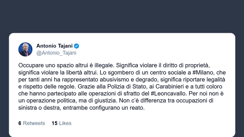 Il ministro degli Esteri, Antonio Tajani, ha commentato su X le operazioni di sfratto del centro sociale LeonCavallo avvenute stamattina a Milano. «Occupare uno spazio altrui è illegale. Significa violare il diritto di proprietà e la libertà altrui». Lo sgombero di un centro sociale a Milano, dice Tajani, con «tanti anni» di abusivismo e degrado, significa riportare il «rispetto delle regole». Per il ministro la vicenda non è operazione politica, ma di giustizia. «Non c’è differenza tra occupazioni di sinistra o destra, entrambe configurano un reato».