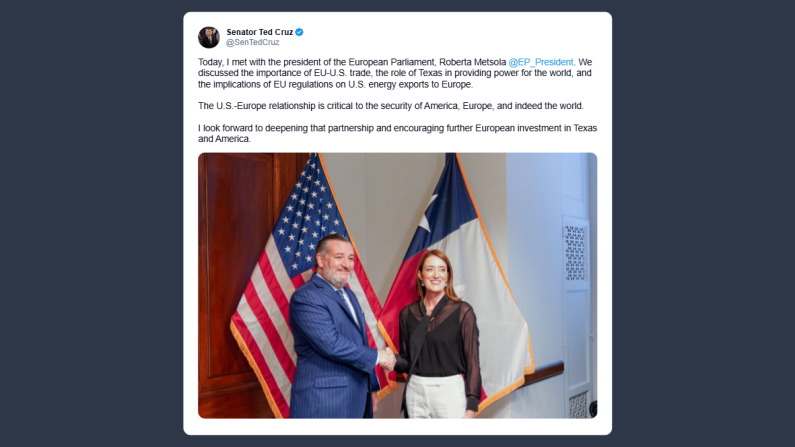 «Oggi ho incontrato il presidente del Parlamento europeo, Roberta Metsola. Abbiamo parlato dell’importanza del commercio Ue-Usa, del ruolo del Texas nel fornire energia al mondo e delle implicazioni delle norme europee sulle esportazioni energetiche americane verso l’Europa. Il rapporto Usa-Europa è decisivo per la sicurezza degli Stati Uniti, del continente e del pianeta intero. Guardo con favore all’approfondimento di questa partnership e a nuovi investimenti europei in Texas e negli Stati Uniti».