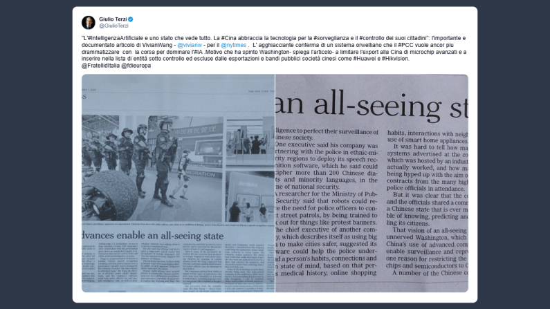 Il senatore Giulio Terzi ha scritto su X: «l’Intelligenza artificiale e uno stato che vede tutto. La Cina abbraccia la tecnologia per la sorveglianza e il controllo dei suoi cittadini. L’importante e documentato articolo di Vivian Wang per il New York Times. L’agghiacciante conferma di un sistema orwelliano che il Pcc vuole ancor più drammatizzare con la corsa per dominare l’Ia. Motivo che ha spinto Washington, spiega l’articolo, a limitare l’export alla Cina di microchip avanzati e a inserire nella lista di entità sotto controllo ed escluse dalle esportazioni e bandi pubblici società cinesi come Huawei e Hikvision».