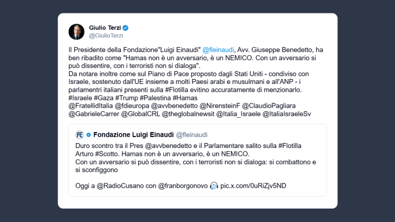 Il senatore Giulio Terzi ha dichiarato ieri su X: «Il Presidente della Fondazione Luigi Einaudi, Giuseppe Benedetto, ha ribadito come Hamas non è un avversario, ma un nemico. Con un avversario si può dissentire, con i terroristi non si dialoga». Da notare inoltre, precisa Terzi, come sul «Piano di Pace proposto dagli Stati Uniti – condiviso con Israele, sostenuto dall’Ue insieme a molti Paesi arabi e musulmani e all’Anp – i parlamentari italiani presenti sulla Flotilla evitino accuratamente di menzionarlo».