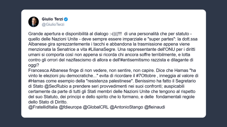 Il senatore Giulio Terzi ha così commentato ieri su X la condotta di Francesca Albanese: