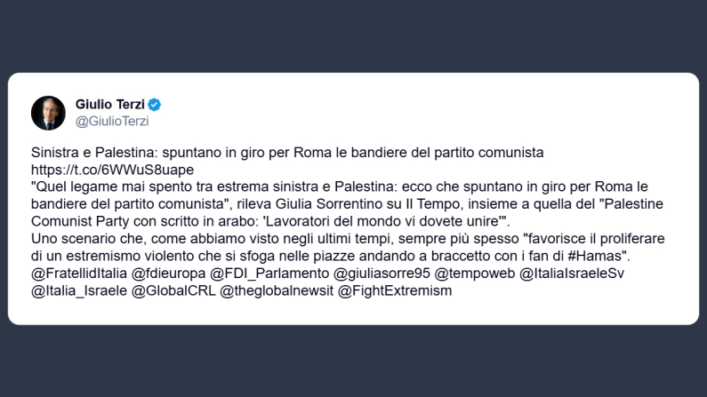 Il senatore Giulio Terzi ha scritto su X: «sinistra e Palestina: spuntano in giro per Roma le bandiere del partito comunista. Quel legame mai spento tra estrema sinistra e Palestina. Ecco che spuntano in giro per Roma le bandiere del partito comunista, rileva Giulia Sorrentino su Il Tempo, insieme a quella del Palestine Comunist Party in arabo: lavoratori del mondo vi dovete unire. Uno scenario che, come abbiamo visto negli ultimi tempi, sempre più spesso favorisce il proliferare di un estremismo violento che si sfoga nelle piazze andando a braccetto con i fan di Hamas».