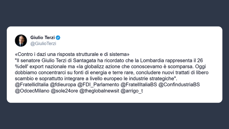 Il senatore Giulio Terzi ha scritto ieri su X: «contro i dazi una risposta strutturale e di sistema».