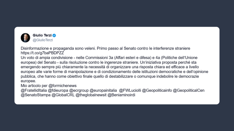 Il senatore Giulio Terzi ha scritto su X: «disinformazione e propaganda sono veleni. Primo passo al Senato contro le interferenze straniere. Un voto di ampia condivisione sulla risoluzione contro le ingerenze straniere». Una iniziativa proposta – ha spiegato Terzi – perché sta emergendo sempre più chiaramente la necessità di organizzare una «risposta chiara ed efficace a livello europeo alle varie forme di manipolazione e di condizionamento delle istituzioni democratiche e dell’opinione pubblica, che hanno come obiettivo finale quello di destabilizzare o comunque indebolire le democrazie europee».