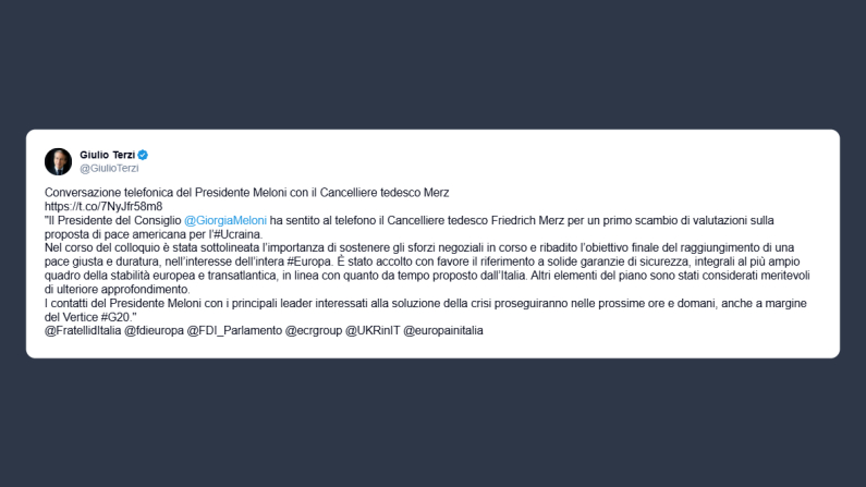 Il senatore Giulio Terzi ha commentato su X la conversazione telefonica del presidente Meloni con il Cancelliere tedesco Merz: «il presidente del Consiglio Giorgia Meloni ha sentito al telefono il Cancelliere tedesco Friedrich Merz per un primo scambio di valutazioni sulla proposta di pace americana per l’Ucraina. Nel corso del colloquio è stata sottolineata l’importanza di sostenere gli sforzi negoziali in corso e ribadito l’obiettivo finale del raggiungimento di una pace giusta e duratura, nell’interesse dell’intera Europa. È stato accolto con favore il riferimento a solide garanzie di sicurezza, integrali al più ampio quadro della stabilità europea e transatlantica, in linea con quanto da tempo proposto dall’Italia. Altri elementi del piano sono stati considerati meritevoli di ulteriore approfondimento. I contatti del presidente Meloni con i principali leader interessati alla soluzione della crisi proseguiranno nelle prossime ore e domani, anche a margine del vertice G20».