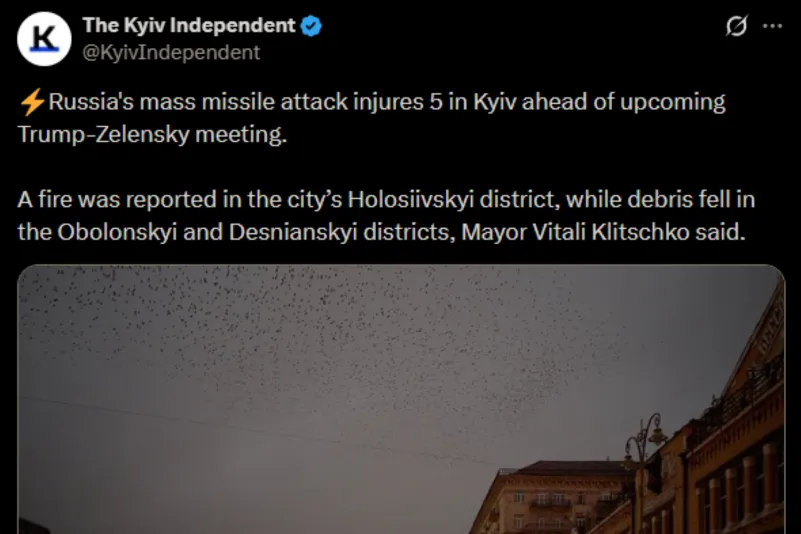 Il quotidiano ucraino The Kyiv Independent ha scritto su X: «️l’attacco missilistico di massa russo ha ferito 5 persone a Kiev in vista dell’imminente incontro Trump-Zelensky. È stato segnalato un incendio nel quartiere Holosiivskyi della città, mentre detriti sono caduti nei quartieri di Obolonskyi e Desnianskyi, ha dichiarato il sindaco Vitali Klitschko».