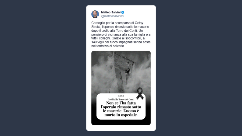 Il segretario della Lega, Matteo Salvini, ha scritto su X: «Cordoglio per la scomparsa di Octay Stroici, l’operaio rimasto sotto le macerie dopo il crollo alla Torre dei Conti. Un pensiero di vicinanza alla sua famiglia e a tutti i colleghi. Grazie ai soccorritori, ai 140 vigili del fuoco impegnati senza sosta nel tentativo di salvarlo».
