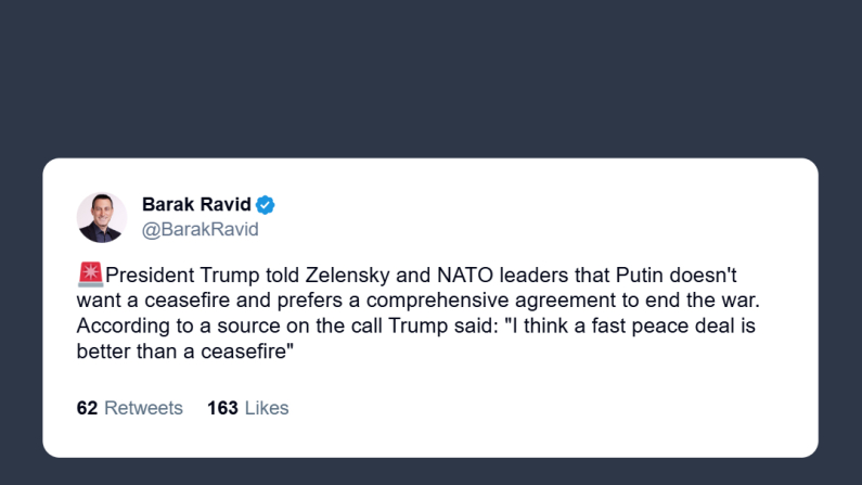 Il giornalista di Axios Barak Ravid ha riportato su X che il presidente degli Stati Uniti Donald Trump, durante una chiamata con il presidente ucraino Volodymyr Zelensky e la Nato, ha dichiarato che Vladimir Putin non è interessato a un «cessate il fuoco», ma preferirebbe piuttosto un «accordo mondiale» per porre fine alla guerra: «penso che un accordo di pace rapido sia meglio di un cessate il fuoco».