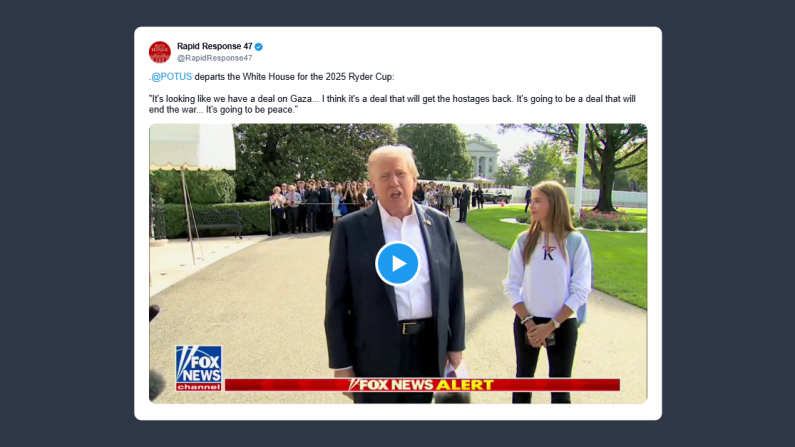 La Casa Bianca ha riportato su X il commento del presidente degli Stati Uniti, sul raggiungimento della pace a Gaza: «Sembra che abbiamo raggiunto un accordo su Gaza… Credo sia un accordo che riporterà a casa gli ostaggi. Sarà un accordo che porrà fine alla guerra… Sarà la pace.»