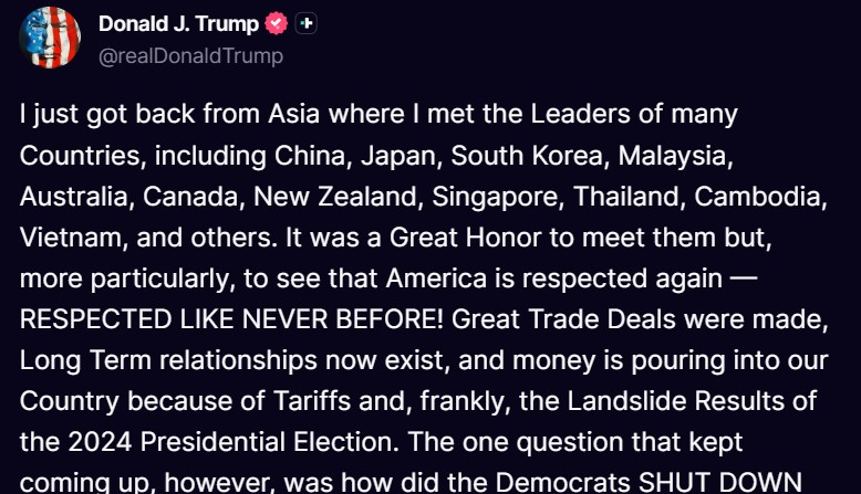 Il presidente degli Stati Uniti, Donald Trump, ha scritto su Truth: «Sono appena rientrato dall’Asia, dove ho incontrato i leader di numerosi Paesi, tra cui Cina, Giappone, Corea del Sud, Malaysia, Australia, Canada, Nuova Zelanda, Singapore, Thailandia, Cambogia, Vietnam. È stato un grande onore conoscerli, ma soprattutto constatare che l’America è di nuovo rispettata: rispettata come mai prima! Sono stati conclusi accordi commerciali eccellenti, si sono create relazioni durature e denaro affluisce nel nostro paese grazie ai dazi e, francamente, alla vittoria schiacciante nelle elezioni presidenziali del 2024. Una domanda, però, ricorreva incessante: come hanno fatto i Democratici a paralizzare gli Stati Uniti e perché i Repubblicani al potere glielo hanno permesso? Durante il volo di ritorno ci ho riflettuto a lungo: perché?