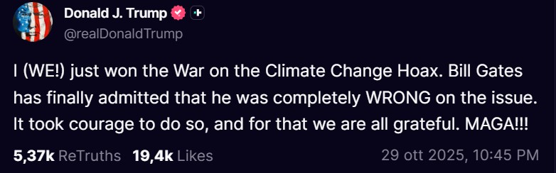 Il presidente degli Stati Uniti, Donald Trump, commentando una nota di Bill Gates sul cambiamento climatico, ha scritto ieri su Truth: