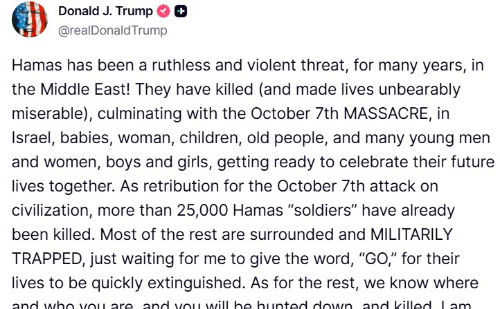 Comunicato integrale del presidente degli Stati Uniti, Donald Trump a Hamas, pubblicato su Truth: