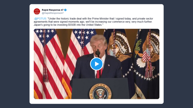 La Casa Bianca ha scritto su X via Rapid Response 47 la seguente dichiarazione del presidente degli Stati Uniti Donald Trump: «con l’accordo commerciale storico che ho firmato oggi con il Primo ministro giapponese Sanae Takaichi e gli accordi del settore privato siglati pochi istanti fa, aumenteremo ulteriormente i nostri scambi. Il Giappone investirà 550 miliardi di dollari negli Stati Uniti».
