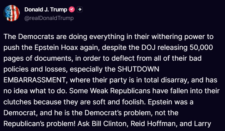 Il presidente degli Stati Uniti, Donald Trump, ha scritto su Truth: «i democratici stanno facendo di tutto, con il loro potere in declino, per rilanciare la bufala Epstein, nonostante il ministero della Giustizia abbia pubblicato 50 mila pagine di documenti, per distogliere l’attenzione dalle loro politiche fallimentari e dalle sconfitte, soprattutto dall’imbarazzo dello shutdown, dove il loro partito è nel caos più totale e non sa che pesci pigliare. Alcuni repubblicani deboli sono caduti nella loro trappola perché sono molli e sciocchi. Epstein era un democratico, e il problema Epstein è dei democratici, non dei repubblicani. Chiedete a Bill Clinton, Reid Hoffman e Larry Summers su Epstein, loro lo conoscono bene. Non perdete tempo con Trump. Io ho un Paese da governare».
