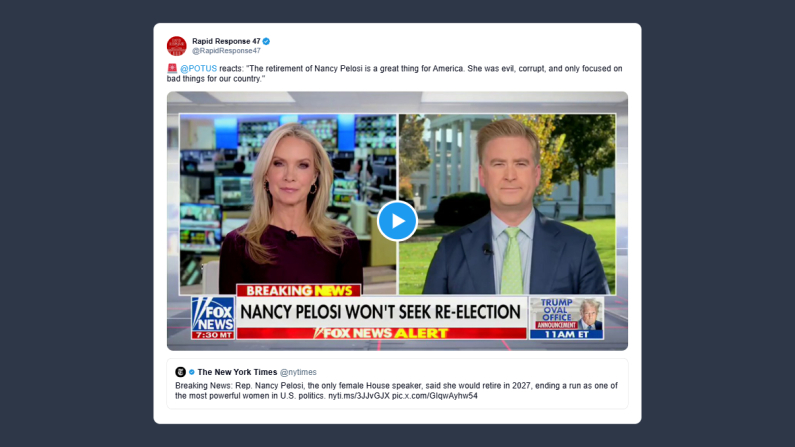 La Casa Bianca ha scritto su X tramite Rapid Response 47 la seguente dichiarazione del presidente Donald Trump: «il ritiro di Nancy Pelosi è una grande notizia per l’America. Era cattiva, corrotta e concentrata solo su ciò che poteva danneggiare il nostro paese».