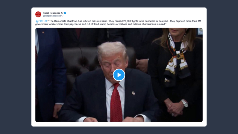 «La chiusura imposta dai democratici ha provocato danni enormi. Ha causato la cancellazione o il ritardo di 20 mila voli, ha privato oltre un milione di dipendenti pubblici del salario e interrotto i buoni alimentari per milioni di americani bisognosi».