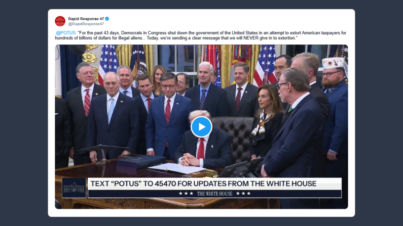 La Casa Bianca ha scritto su X via Rapid Response 47 la seguente dichiarazione del presidente Donald Trump: «Per 43 giorni i democratici al Congresso hanno bloccato il governo degli Stati Uniti nel tentativo di estorcere ai contribuenti americani centinaia di miliardi di dollari per gli immigrati irregolari. Oggi mandiamo un messaggio chiaro: non cederemo mai all’estorsione».