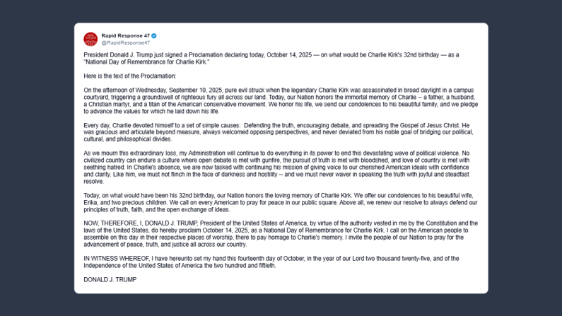 La Casa Bianca ha scritto su X che il presidente Trump ha proclamato il 14 ottobre, giorno di nascita di Charlie Kirk, Giornata nazionale in onore di Charlie Kirk.