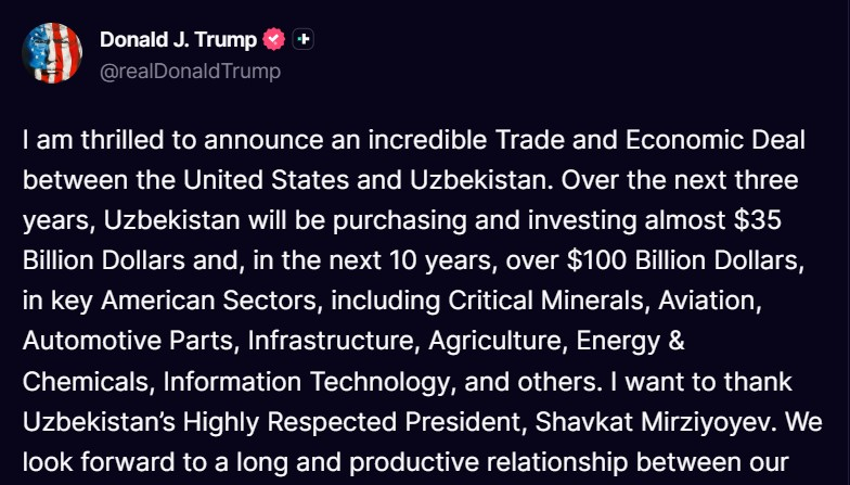 Il presidente degli Stati Uniti, Donald Trump, ha scritto su Truth: «sono lieto di annunciare uno straordinario accordo commerciale ed economico tra Stati Uniti e Uzbekistan. Nei prossimi tre anni Tashkent acquisterà e investirà quasi 35 miliardi di dollari e nei successivi dieci anni, oltre 100 miliardi di dollari in settori strategici americani: minerali fondamentali, aviazione, componentistica automobilistica, infrastrutture, agricoltura, energia e chimica, tecnologie dell’informazione e altri. Ringrazio il presidente dell’Uzbekistan Shavkat Mirziyoyev, uomo di grande rispetto. Attendiamo con fiducia una relazione lunga e proficua tra i nostri paesi».