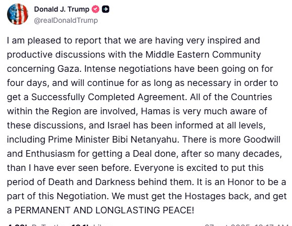 «Sono lieto di comunicare che stiamo tenendo discussioni molto ispirate e produttive con la Comunità mediorientale riguardo a Gaza. Le trattative, intense, proseguono da quattro giorni e continueranno per tutto il tempo necessario a raggiungere un accordo pienamente soddisfacente. Tutti i paesi della regione sono coinvolti, Hamas è ben consapevole di queste discussioni e Israele è stato informato a tutti i livelli, incluso il primo ministro Benjamin Netanyahu. C’è più buona volontà ed entusiasmo per concludere un accordo, dopo decenni di conflitti, di quanto abbia mai visto prima. Tutti sono desiderosi di lasciarsi alle spalle questo periodo di morte e oscurità. È un onore prendere parte a questa negoziazione. Dobbiamo riportare a casa gli ostaggi e ottenere una pace permanente e duratura!».