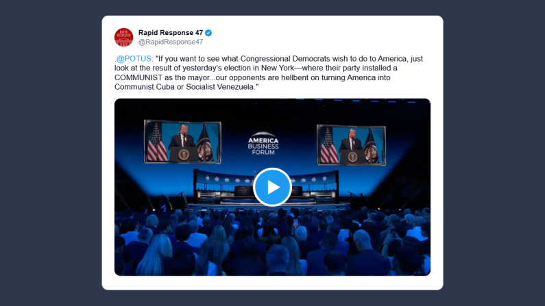 La Casa Bianca ha scritto su X via Rapid Response 47 la seguente dichiarazione del presidente Donald Trump: «se volete vedere cosa vogliono fare all’America i democratici del Congresso guardate il risultato delle elezioni di ieri a New York. Il loro partito ha insediato un comunista come sindaco. I nostri avversari sono decisi a trasformare l’America nella Cuba comunista o nel Venezuela socialista».