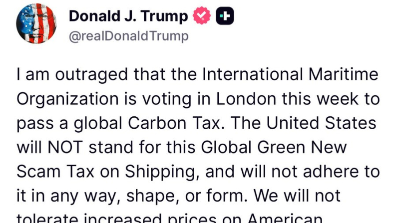 Il presidente degli Stati Uniti, Donald Trump, ha scritto ieri su Truth: «Sono indignato che l’Organizzazione marittima internazionale stia votando a Londra questa settimana per approvare una tassa mondiale sull’anidride carbonica». Gli Stati Uniti, ha sottolineato Trump, «non tollereranno questa truffa del Green new deal applicata alla navigazione e non vi aderiranno in alcun modo». Trump ha poi sottolineato che «non accetteremo aumenti dei prezzi per i consumatori americani né la creazione di una burocrazia del Green New Deal che sperperi i vostri soldi per i loro sogni ecologici. Unitevi agli Stati Uniti e votate No a Londra domani».