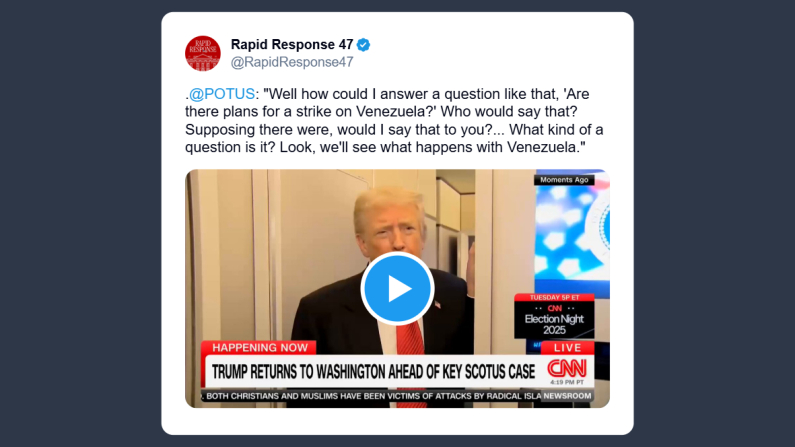 La Casa Bianca ha riportato su X la risposta di Donald Trump alla domanda se «esistono piani [degli Stati Uniti ndr] per un attacco al Venezuela». Trump ha dichiarato: «Come potrei rispondere a una domanda del genere. Chi lo direbbe? Ammesso che ci fossero, ve lo direi? Che razza di domanda è? Vedremo cosa succederà con il Venezuela».