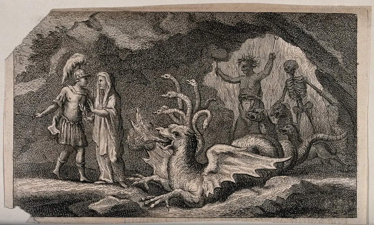 Una scena dall’Eneide di Virgilio: la Sibilla Cumana guida Enea attraverso gli inferi. Incisione. Collezioni iconografiche. (Pubblico dominio)