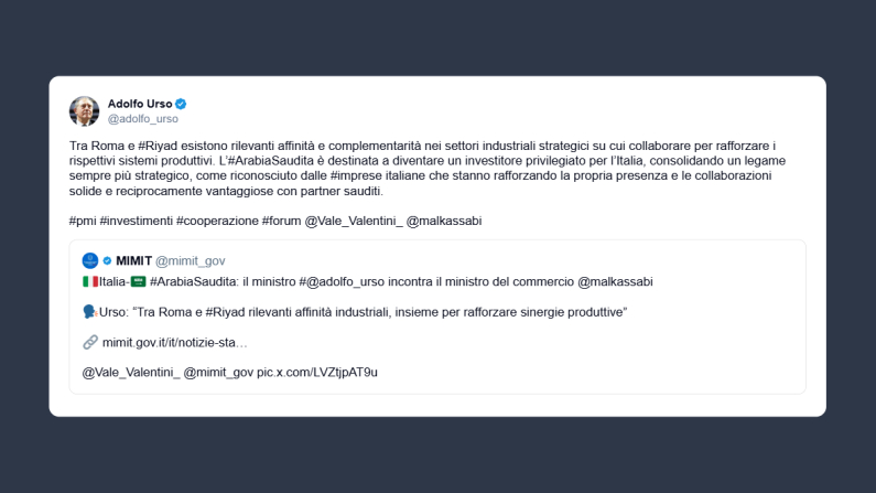 Il ministro delle Imprese e del Made in Italy, Adolfo Urso, ha scritto su X: «tra Roma e Riyad esistono rilevanti affinità e complementarità nei settori industriali strategici su cui collaborare per rafforzare i rispettivi sistemi produttivi. L’Arabia Saudita è destinata a diventare un investitore privilegiato per l’Italia, consolidando un legame sempre più strategico, come riconosciuto dalle imprese italiane che stanno rafforzando la propria presenza e le collaborazioni solide e reciprocamente vantaggiose con partner sauditi».