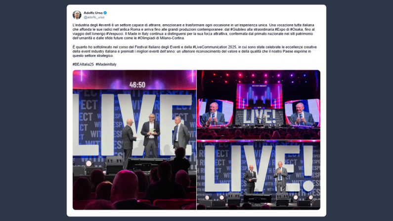 Il ministro delle Imprese e del Made in Italy, Adolfo Urso, ha scritto su X: «l’industria degli eventi è un settore capace di attrarre, emozionare e trasformare ogni occasione in un’esperienza unica. Una vocazione tutta italiana che affonda le sue radici nell’antica Roma e arriva fino alle grandi produzioni contemporanee, dal Giubileo alla straordinaria Expo di Osaka, fino al viaggio dell’Amerigo Vespucci. Il Made in Italy continua a distinguersi per la sua forza attrattiva, confermata dal primato nazionale nei siti patrimonio dell’umanità e dalle sfide future come le Olimpiadi di Milano Cortina. È quanto ho sottolineato nel corso del Festival italiano degli eventi e della Live Communication 2025, in cui sono state celebrate le eccellenze creative della event industry italiana e premiati i migliori eventi dell’anno, un ulteriore riconoscimento del valore e della qualità che il nostro Paese esprime in questo settore strategico».