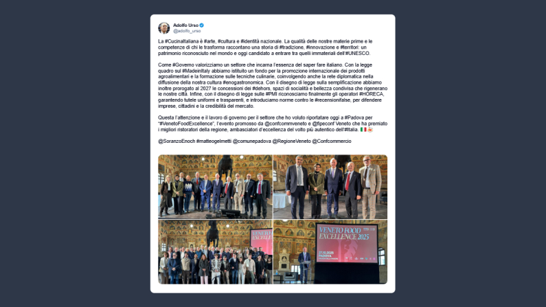 Il ministro delle Imprese e del Made in Italy, Adolfo Urso, ha scritto su X: «la cucina Italiana è arte, cultura e identità nazionale. La qualità delle nostre materie prime e le competenze di chi le trasforma raccontano una storia di tradizione, innovazione e territori. Un patrimonio riconosciuto nel mondo e oggi candidato a entrare tra quelli immateriali dell’Unesco. Come Governo valorizziamo un settore che incarna l’essenza del saper fare italiano. Con la legge quadro sul Made in Italy abbiamo istituito un fondo per la promozione internazionale dei prodotti agroalimentari e la formazione sulle tecniche culinarie, coinvolgendo anche la rete diplomatica nella diffusione della nostra cultura enogastronomica. Con il disegno di legge sulla semplificazione abbiamo inoltre prorogato al 2027 le concessioni dei dehors, spazi di socialità e bellezza condivisa che rigenerano le nostre città. Infine, con il disegno di legge sulle Pmi riconosciamo finalmente gli operatori Horeca, garantendo tutele uniformi e trasparenti, e introduciamo norme contro le recensioni false, per difendere imprese, cittadini e la credibilità del mercato. Questa l’attenzione e il lavoro di governo per il settore che ho voluto riportare oggi a Padova per “Veneto food excellence”, l’evento promosso da confcommveneto e fipeconf Veneto che ha premiato i migliori ristoratori della regione, ambasciatori d’eccellenza del volto più autentico dell’Italia».