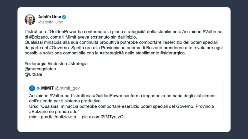 Il ministro delle Imprese e del Made in Italy, Adolfo Urso, ha scritto ieri su X: «L’istruttoria Golden Power ha confermato la piena strategicità dello stabilimento Acciaierie Valbruna di Bolzano, come il Mimit aveva sostenuto sin dall’inizio. Qualsiasi minaccia alla sua continuità produttiva potrebbe comportare l’esercizio dei poteri speciali da parte del Governo. Spetta ora alla Provincia autonoma di Bolzano prenderne atto e valutare ogni possibile soluzione compatibile con la strategicità dello stabilimento siderurgico».
