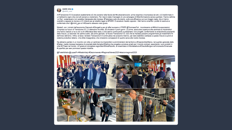 Il ministro delle Imprese e del Made in Italy, Adolfo Urso, ha scritto su X: «a Transizione 5.0 è accaduto esattamente ciò che avviene nella favola del brutto anatroccolo, prima respinta e incompresa da tutti, si è trasformata in un bellissimo cigno che ora tutti cercano e reclamano. Per mesi è stata il bersaglio di una campagna di disinformazione senza quartiere, l’hanno definita “un flop”, sostenevano non sarebbe interessata alle imprese. Fake news sullo strumento, sulla sua efficacia e sul suo tiraggio reale, che ci hanno costretti a cappare le risorse a 2 miliardi e 500 milioni per gli obiettivi legati al Pnrr. È accaduto l’esatto opposto, i fatti hanno smentito i profeti di sventura e confermato che il ministero delle Imprese e del Made in Italy e il Governo avevano visto giusto. Martedì, con i ministri dell’economia Giancarlo Giorgetti e per gli Affari europei e il Pnrr Tommaso Foti, incontreremo al ministero delle Imprese e del Made in Italy le associazioni d’impresa sul futuro di Transizione 5.0. Ci attendono tre sfide, da chiudere in pochi giorni. La prima è assicurare copertura alle centinaia di imprenditori che hanno creduto a noi e non a chi diffondeva fake news, e che stanno continuando a presentare i loro progetti, confermando la straordinaria popolarità della misura. La seconda è far partire subito, dal primo gennaio, la nuova Transizione 5.0, così che le imprese possano programmare gli investimenti fin dall’inizio dell’anno. Infine, la terza è rendere Transizione 5.0 continuativa nel prossimo triennio, per dare stabilità e certezze a questa misura e quindi al sistema produttivo italiano. Una sfida impegnativa, che vinceremo consapevoli di quanto serva alle nostre imprese».