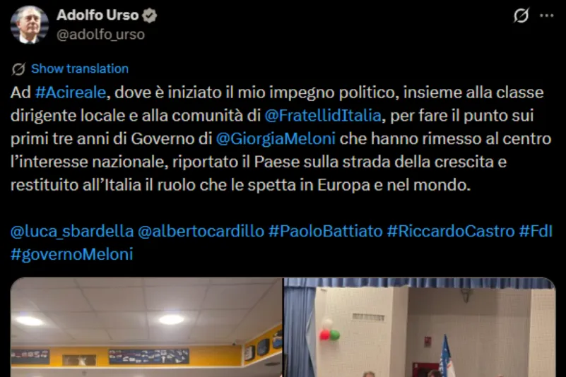 Il ministro delle Imprese e del Made in Italy Adolfo Urso ha scritto su X: «ad Acireale, dove è iniziato il mio impegno politico, insieme alla classe dirigente locale e alla comunità di Fratelli d’Italia, per fare il punto sui primi tre anni di Governo di Giorgia Meloni che hanno rimesso al centro l’interesse nazionale, riportato il Paese sulla strada della crescita e restituito all’Italia il ruolo che le spetta in Europa e nel mondo».