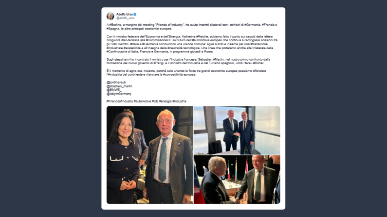 Il ministro delle Imprese e del Made in Italy, Adolfo Urso, ha scritto ieri su X: «A Berlino, a margine del meeting “Friends of Industry”, ho avuto incontri bilaterali con i ministri di Germania, Francia e Spagna, le altre principali economie europee. Con il ministro federale dell’Economia e dell’Energia, Katherina Reiche, abbiamo fatto il punto sui seguiti della lettera congiunta italo-tedesca alla Commissione europea sul futuro dell’automotive europeo che continua a raccogliere adesioni tra gli Stati membri. Italia e Germania condividono una visione comune: agire subito e insieme per una transizione industriale sostenibile e all’insegna della neutralità tecnologica. Una linea che porteremo anche alla trilaterale delle Confindustrie di Italia, Francia e Germania, in programma giovedì a Roma. Sugli stessi temi ho incontrato il ministro per l’Industria francese, Sébastien Martin, nel nostro primo confronto dalla formazione del nuovo governo di Parigi, e il ministro dell’Industria e del Turismo spagnolo, Jordi Hereu Boher. È il momento di agire ora, insieme, perché solo unendo le forze tra grandi economie europee possiamo difendere l’industria del continente e rilanciare la competitività europea».