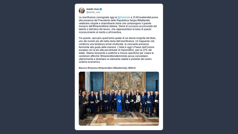 Il ministro delle Imprese e del Made in Italy, Adolfo Urso, ha scritto su X: «Le onorificenze consegnate oggi al Quirinale a 25 Cavalieri de Lavoro, alla presenza del Presidente della Repubblica Sergio Mattarella, celebrano singole e straordinarie storie che compongono il grande mosaico dell’imprenditoria italiana. Storie di successo accomunate dal talento e dall’etica del lavoro, che rappresentano la base di questo riconoscimento al merito e all’inventiva». Tra queste, precisa il ministro, spiccano quest’anno quelle di «sei donne insignite del titolo, uno dei numeri più alti nella storia dell’onorificenza. Un traguardo che conferma una tendenza ormai strutturale: la crescente presenza femminile alla guida delle imprese. L’Italia è oggi il Paese dell’Ue con la più alta percentuale di imprenditrici, pari al 22% del totale».
