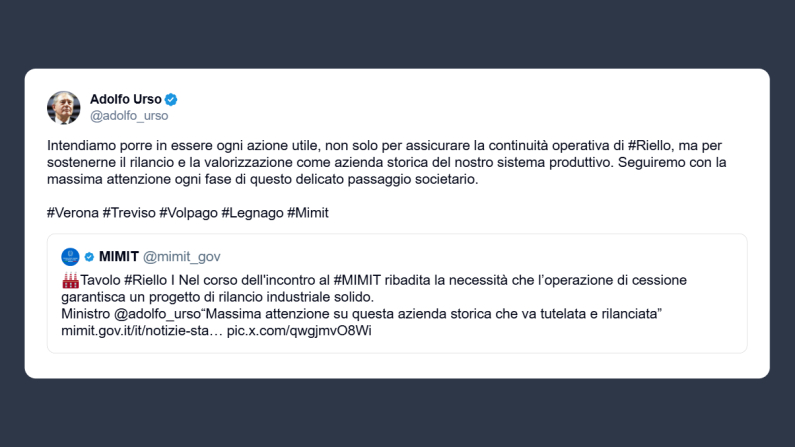 Il ministro delle Imprese e del Made in Italy, Adolfo Urso, ha scritto su X: «Intendiamo porre in essere ogni azione utile, non solo per assicurare la continuità operativa di Riello, ma per sostenerne il rilancio e la valorizzazione come azienda storica del nostro sistema produttivo. Seguiremo con la massima attenzione ogni fase di questo delicato passaggio societario».