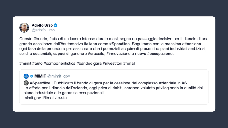 Il ministro delle Imprese e del Made in Italy, Adolfo Urso, ha scritto su X: «Questo bando, frutto di un lavoro intenso durato mesi, segna un passaggio decisivo per il rilancio di una grande eccellenza dell’automotive italiano come Speedline. Seguiremo con la massima attenzione ogni fase della procedura per assicurare che i potenziali acquirenti presentino piani industriali ambiziosi, solidi e sostenibili, capaci di generare crescita, innovazione e nuova occupazione».
