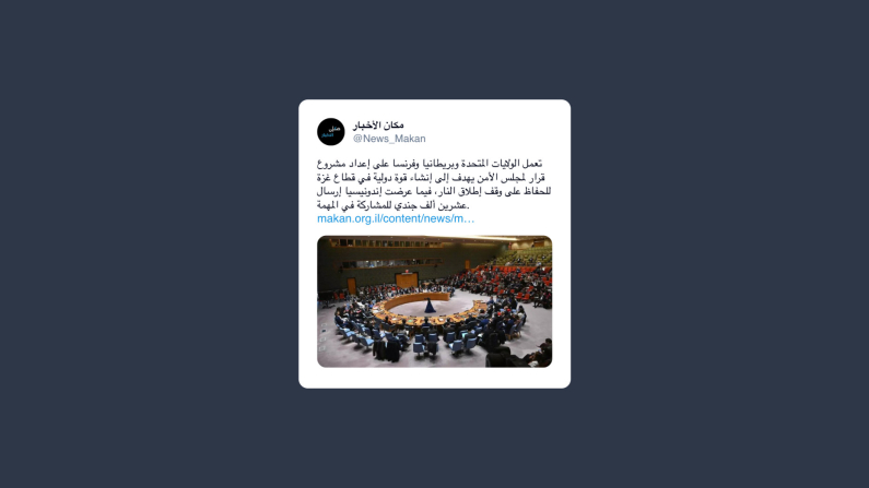 Secondo quanto riportato dall’account ufficiale dell’Autorità israeliana per la radiodiffusione (Makan, @News_Makan) in un tweet pubblicato in lingua araba su X, gli Stati Uniti, il Regno Unito e la Francia stanno lavorando all’elaborazione di un progetto di risoluzione da sottoporre al Consiglio di Sicurezza delle Nazioni Unite. Il testo della risoluzione mirerebbe all’istituzione di una forza internazionale nella Striscia di Gaza con il mandato di supervisionare e mantenere un cessate il fuoco.
