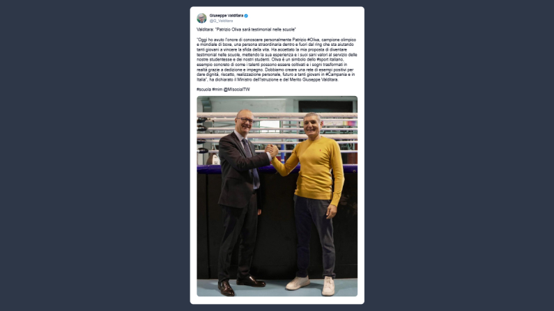 Il ministro dell’Istruzione, Giuseppe Valditara, ha scritto su X: «Patrizio Oliva sarà testimonial nelle scuole. Oggi ho avuto l’onore di conoscere personalmente Patrizio Oliva, campione olimpico e mondiale di boxe, una persona straordinaria dentro e fuori dal ring che sta aiutando tanti giovani a vincere la sfida della vita. Ha accettato la mia proposta di diventare testimonial nelle scuole, mettendo la sua esperienza e i suoi sani valori al servizio delle nostre studentesse e dei nostri studenti. Oliva è un simbolo dello sport italiano, esempio concreto di come i talenti possono essere coltivati e i sogni trasformati in realtà grazie a dedizione e impegno. Dobbiamo creare una rete di esempi positivi per dare dignità, riscatto, realizzazione personale, futuro a tanti giovani in Campania e in Italia”, ha dichiarato il ministro dell’Istruzione e del Merito Giuseppe Valditara».
