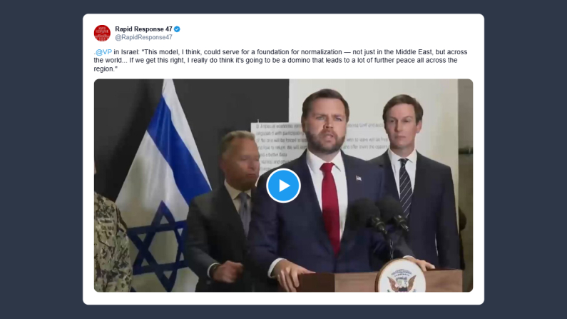 La Casa Bianca ha riportato ieri su X le parole del vice presidente degli Stati Uniti, J.D. Vance, in visita ufficiale in Israele: «Questo modello, a mio avviso, potrebbe costituire una base per la normalizzazione, non solo in Medio Oriente, ma in tutto il mondo. Se riusciremo a realizzarlo correttamente, credo davvero che causerà un effetto domino che porterà a una pace più ampia in tutta la regione».