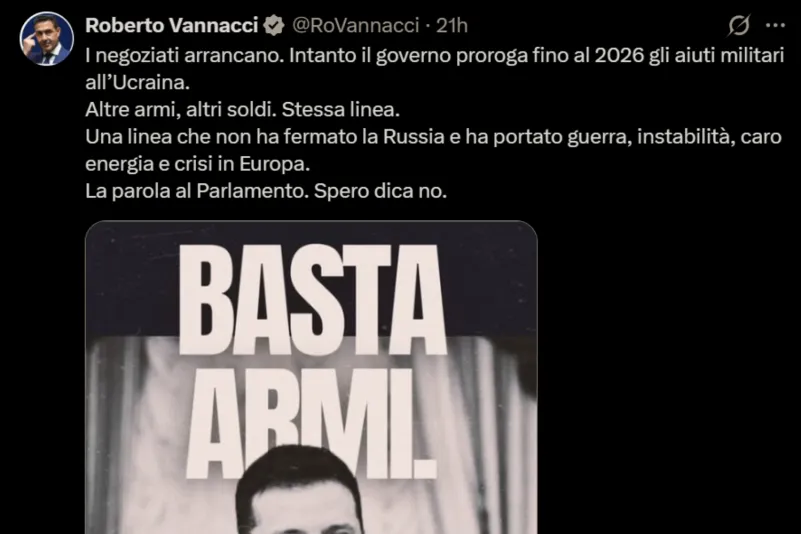 Il Generale e vicesegretario della Lega Roberto Vannacci ha scritto su X: «i negoziati arrancano. Intanto il governo proroga fino al 2026 gli aiuti militari all’Ucraina. Altre armi, altri soldi. Stessa linea. Una linea che non ha fermato la Russia e ha portato guerra, instabilità, caro energia e crisi in Europa. La parola al Parlamento. Spero dica no».