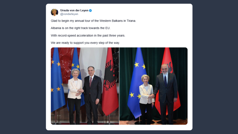 Il presidente della Commissione Europea, Ursula von der Leyen, ha annunciato su X l’inizio del tour annuale nei Balcani occidentali a Tirana: «L’Albania è sulla strada giusta verso l’Unione europea, con un’accelerazione record negli ultimi tre anni. Siamo pronti a sostenervi in ogni fase del percorso».
