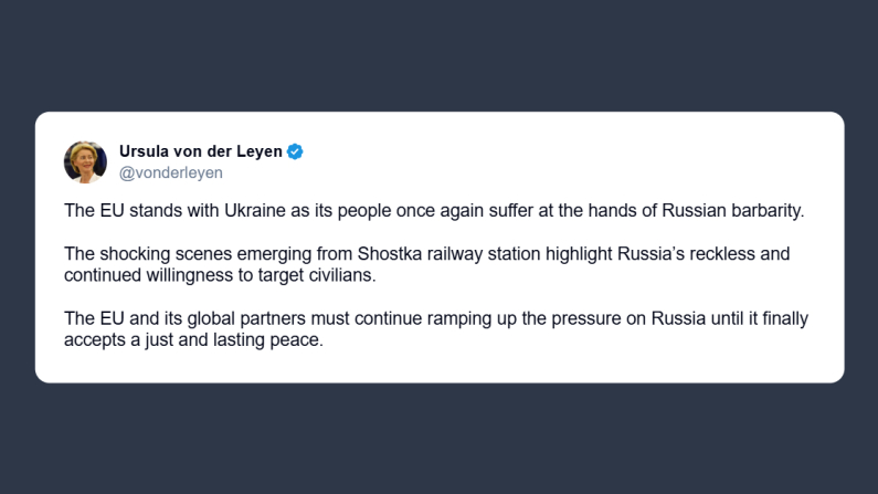 «L’Unione Europea è al fianco dell’Ucraina mentre il suo popolo soffre ancora una volta per la brutalità russa. Le scioccanti immagini provenienti dalla stazione ferroviaria di Shostka evidenziano la sconsiderata e persistente volontà della Russia di colpire i civili. L’Unione Europea e i suoi partner mondiali devono continuare ad aumentare la pressione sulla Russia finché non accetterà una pace giusta e duratura».